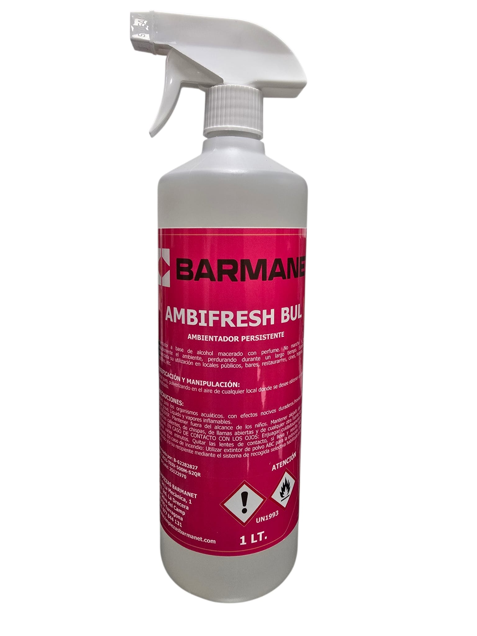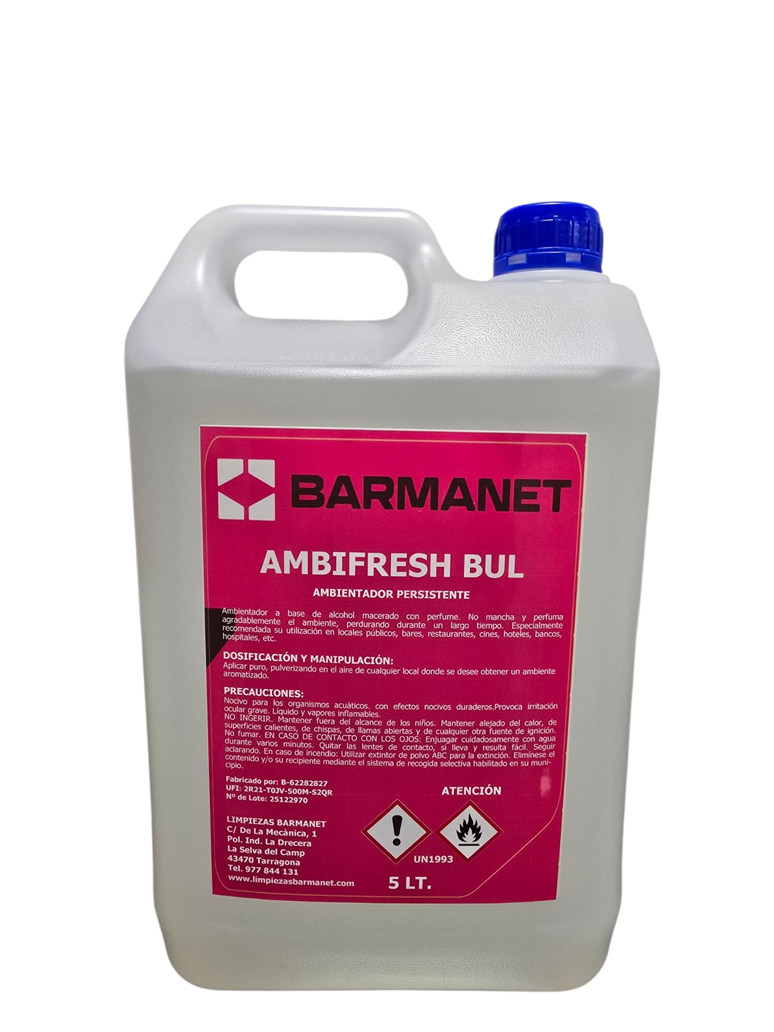 El ambientador  Ambifresh Bul de Barmanet, a base de alcohol macerado con perfume aroma a Bulgari . No mancha y perfuma agradablemente el ambiente, perdurando durante un largo tiempo. Especialmente recomendada su utilización en locales públicos, bares, restaurantes, cines, hoteles, bancos, hospitales, etc.