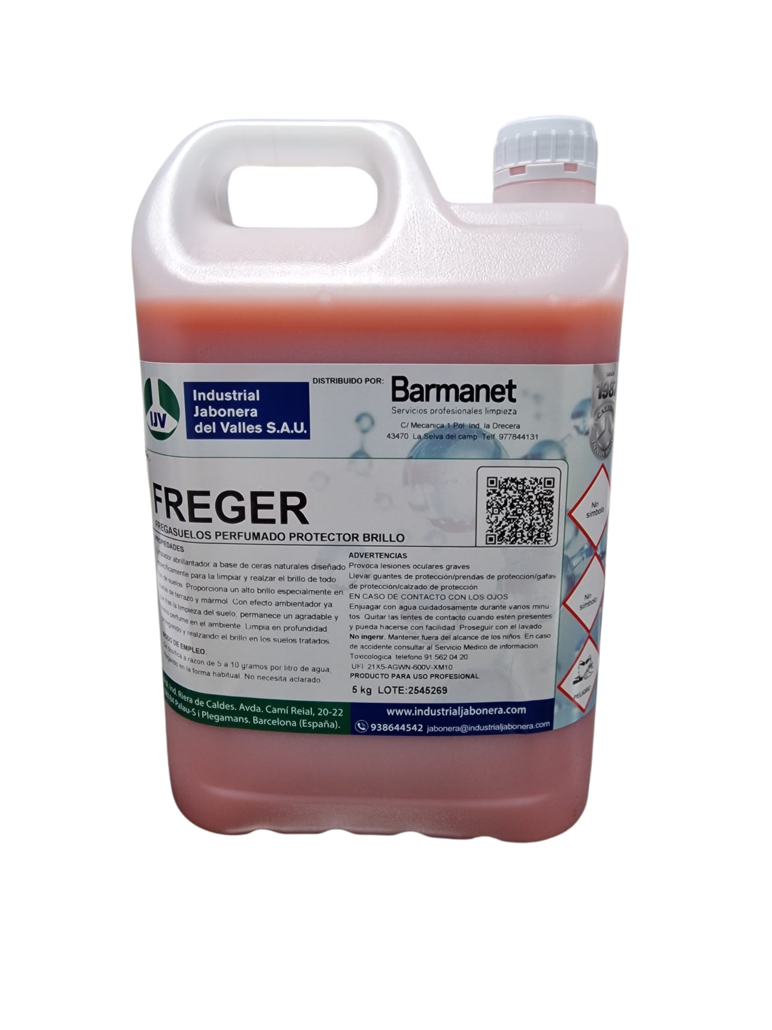 El limpiador Freger de Barmanet, es un limpiador abrillantador a base de ceras naturales diseñado específicamente para limpiar y realizar el brillo de todo tipo de suelos. Proporciona un alto brillo especialmente en suelos de terrazo y mármol. Con efecto ambientador ya que tras la limpieza del suelo, permanece un agradable y fresco perfume en el ambiente, Limpia en profundidad, protegiendo y realzando el brillo en los suelos tratados.