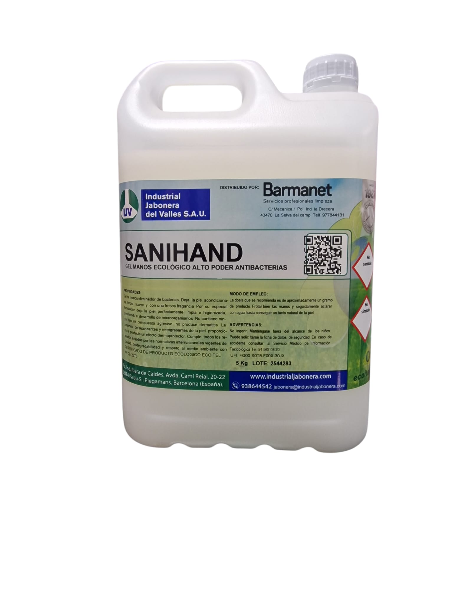 El gel de manos ecológico Sanihand de Barmanet, es un jabón de manos eliminador de bacterias. Deja la piel acondicionada, limpia, suave y con una fresca fragancia. Por su especial formulación deja la piel perfectamente limpia e higienizada, previniendo el desarrollo de microorganismos. No contiene ningún tipo de compuesto agresivo, no produce dermatitis. La presencia de suavizantes y reengrasantes de la piel proporciona al producto un efecto dermoprotector. SANIHAND cumple todos los requisitos exigidos por las normativas internacionales vigentes de calidad, biodegradabilidad y respeto al medio ambiente con CERTIFICADO DE PRODUCTO ECOLÓGICO ECOITEL Nº CE-2670