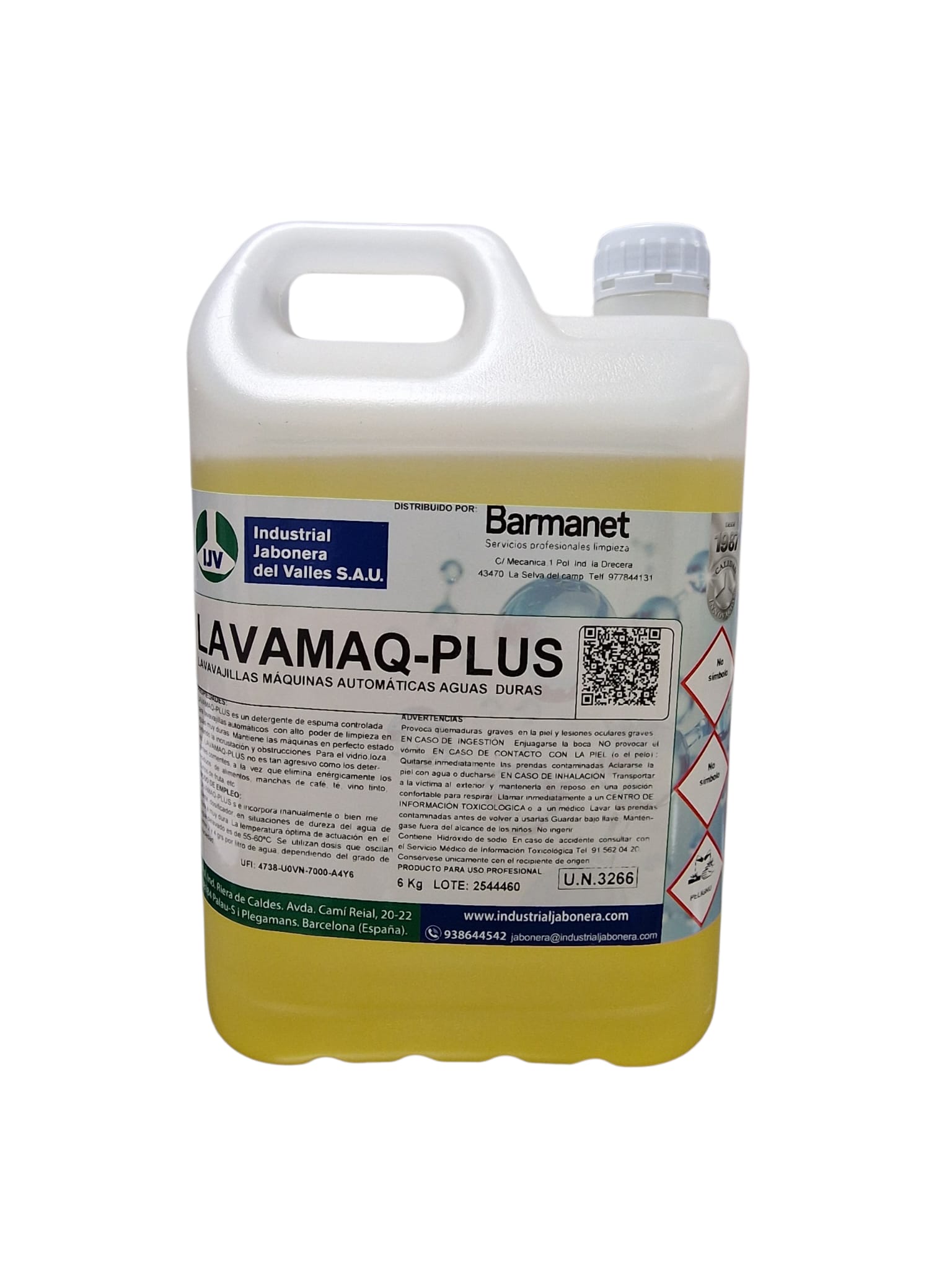 El lavavajillas máquinas automáticas Lavamaq Plus de Barmanet, es un detergente de espuma controlada para lavavajillas automáticos con alto poder de limpieza en aguas muy duras. Mantiene las máquinas en perfecto estado evitando la incrustación y obstrucciones. Para el vidrio, loza, etc. LAVAMAQ-PLUS no es tan agresivo como los detergentes corrientes, a la vez que elimina enérgicamente los residuos de alimentos, manchas de café, té, vino tinto, zumos de fruta, etc..