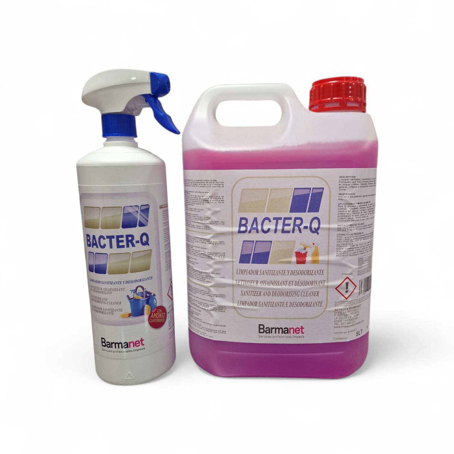 El Bacter Q de Barmanet, es un limpiador sanitizante y desodorizante multi superficies, a base de Amonio-cuaternario. Ideal para la limpieza y saneamiento de puertas, pica-portes, suelos y paredes en lugares públicos, hospitales, centros estéticos, clínicas, gimnasios, centros termales, mataderos, establos e industria en general. Disoluble al agua, se puede usar para fregar suelos, paredes, y cualquier tipo de superficie, alto valor desinfectante.